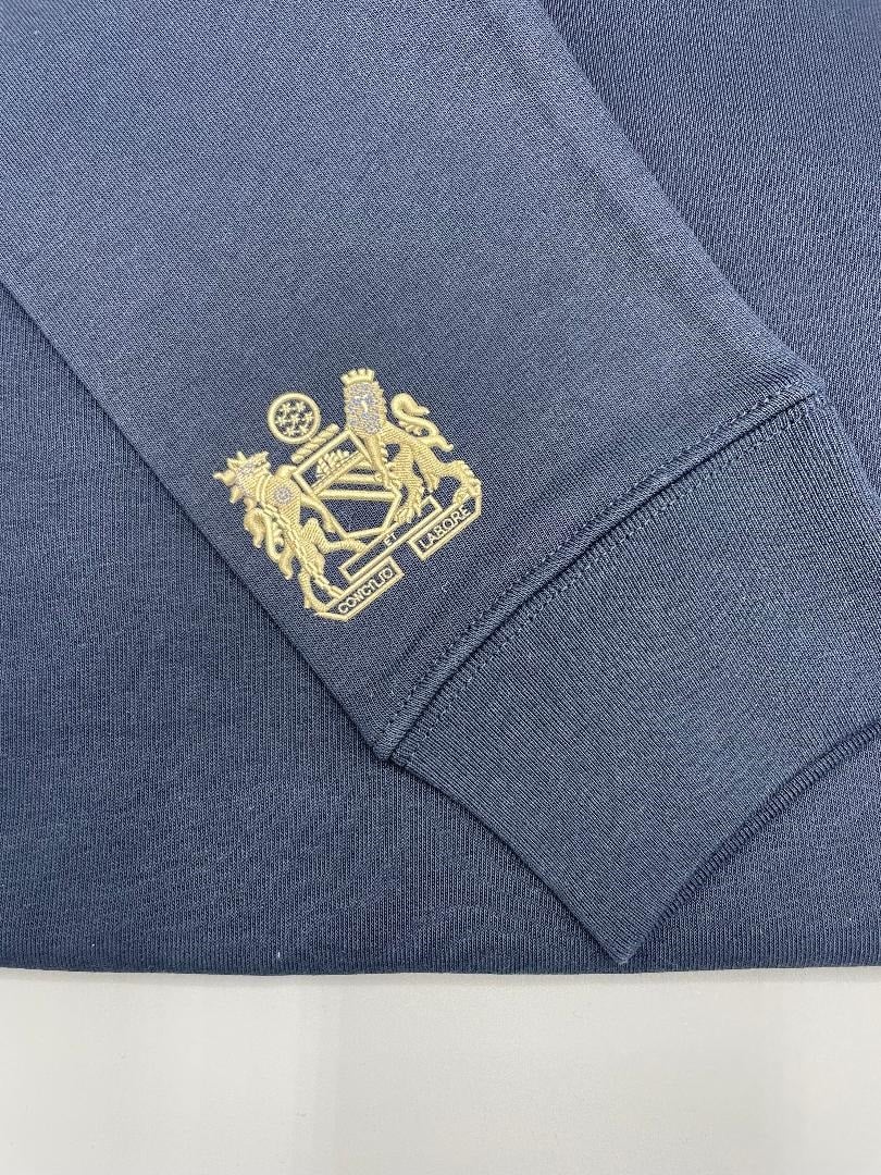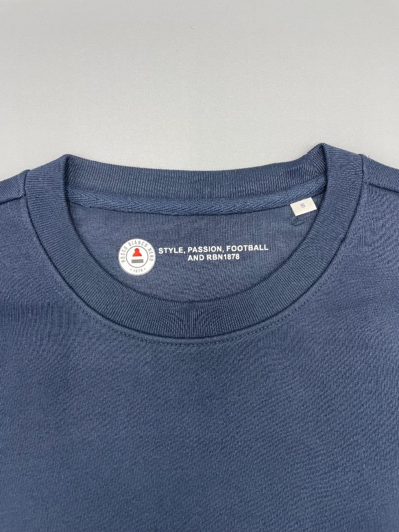 Limited Edition Navy cotton sweatshirt (350gsm), featuring RBN1878 detailing, including screen printed tri colour stripe and Manchester Coat of Arms.